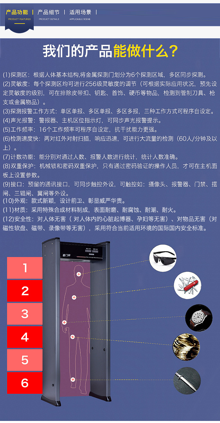 (2)、靈敏度:每個(gè)探測(cè)區(qū)均可進(jìn)行356級(jí)靈敏度的調(diào)節(jié)(可根據(jù)實(shí)際應(yīng)用狀況,預(yù)先設(shè)定靈敏度的級(jí)別,可在排除皮帶扣、鑰匙、首飾、硬幣等物品,檢測(cè)到管制刀具、槍支或金屬物品)。
