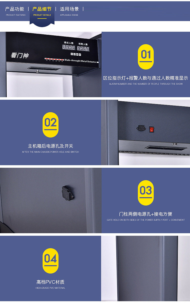 看門神 KMS-600L安檢門(6區(qū))采用電磁兼容設(shè)計(jì)和抗震動(dòng)設(shè)計(jì),具有高靈敏度、強(qiáng)抗干擾能力和強(qiáng)抗震能力,適用于管制刀具和槍支等危險(xiǎn)物品的安全檢查,廣泛應(yīng)用于監(jiān)獄、法院、學(xué)校、醫(yī)院、電子企業(yè)、港口、客運(yùn)站、展覽會(huì)館、會(huì)議中心、重大慶典、演唱會(huì)等重要場(chǎng)所。