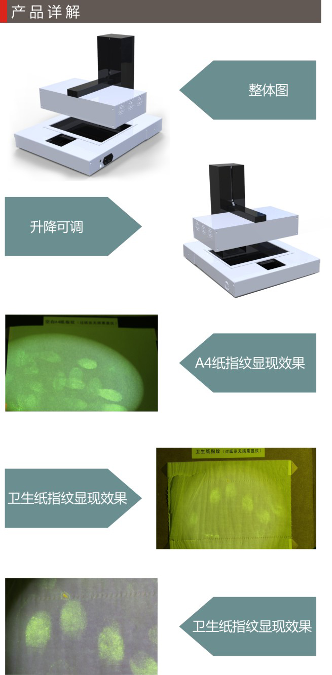 采用觸摸屏技術,可調節不同高度以及溫度和時間來針對不同紙張如A4紙、信封、報紙、便簽紙、餐巾紙、復寫紙、收銀聯等一些紙張上的手印,同時可選配便攜式激光物證發現儀快速發現手印。